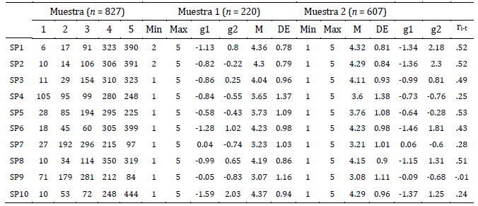 En la Tabla 3 se exponen los estadísticos descriptivos de la ESP para ambas muestras. Para la muestra 1, el promedio oscila entre 3.07 y 4.36 con una variabilidad que fluctúa entre 0.78 y 1.37. En relación con la muestra 2, los promedios de las puntuaciones van entre 3.081 y 4.316; los coeficientes de asimetría sugieren una asimetría negativa en la mayoría de los reactivos; por su parte, los coeficientes de curtosis denotan que la mayor proporción presentan una distribución platicurtica, con excepción de los ítems 4, 2, 7 y 9 los cuales presentan una distribución leptocúrtica. También se reportan las frecuencias de las alternativas de respuesta, el cual es considerado un estadístico que permite interpretar un conjunto de variables de naturaleza ordinal. Estos valores muestran que existe una distribución más acentuada hacia las alternativas 4 y 5. Las correlaciones ítem-test corregido se calcularon para la muestra de 607 participantes, estas muestran que la mayoría de los reactivos están por encima de .20 con excepción del ítem 9.