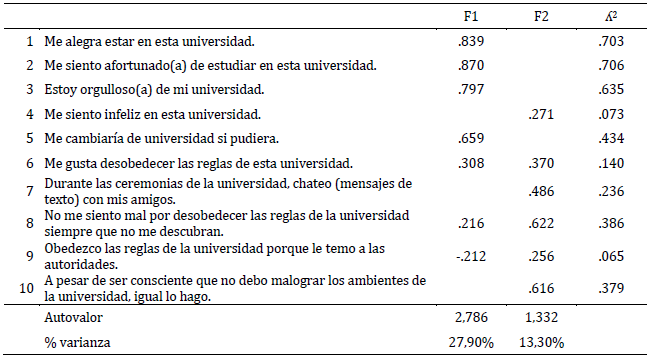En lo referente a la validez estructural de la ESPU se determinó que de los cuatro modelos analizados el Modelo 4 resultó ser el más pertinente. Para su análisis se eliminaron los reactivos que presentaron comportamientos inestables, entre ellos el ítem 4 “Me siento infeliz en esta universidad”, ítem 5 “Me cambiaría de universidad si pudiera”, ítem 9 “Obedezco las reglas de la universidad porque le temo a las autoridades” e ítem 10 “A pesar de ser consciente que no debo malograr los ambientes de la universidad, igual lo hago”, mejorando la eficiencia de la medida y resultando en una estructura parsimoniosa, coherente e interpretable (Fornell & Larcker, 1981).