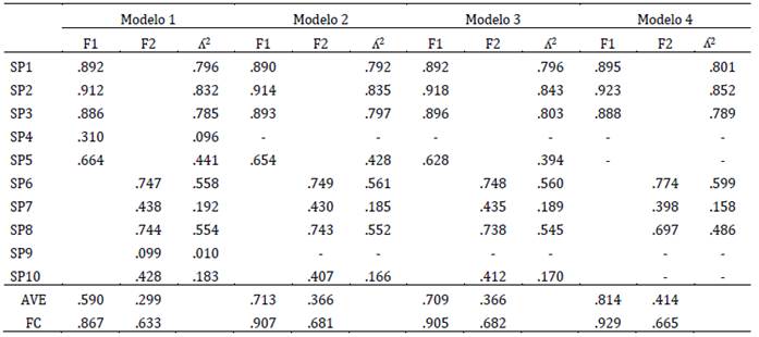 Notas: Modelo 1: Modelo bidimensional original; Modelo 2: Modelo bidimensional sin ítems 4 y 9; Modelo 3: Modelo bidimensional sin ítems 4, 9 y con un error correlacionado entre ítems 5 y F2; Modelo 4: Modelo bidimensional sin ítems 4, 5, 9 y 10.