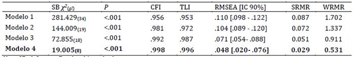 En la Tabla 6, se exponen los índices de ajuste para los modelos analizados, se observa que los índices comparativos sugieren que el Modelo 4 presenta la estructura más parsimoniosa y coherente, ello en consideración que el Modelo 3, pues se sugiere el desplazamiento de un ítem que teóricamente fue concebido para un factor diferente.