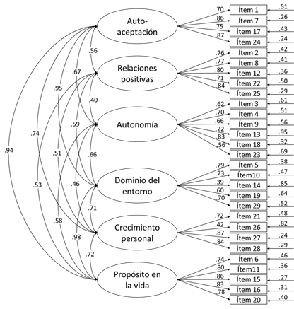 Escala de Bienestar Psicológico (Ryff, 1989). Se utilizó la escala adaptada al español propuesta por Díaz et al. (2006). Este instrumento consta de un total de 29 ítems, con un formato de respuesta tipo Likert, con puntuaciones comprendidas entre 1 (totalmente en desacuerdo) y 6 (totalmente de acuerdo). La escala total se agrupa en seis subescalas: autoaceptación (4 ítems); relaciones positivas (5 ítems); autonomía (6 ítems); dominio del entorno (5 ítems), propósito en la vida (5 ítems) y crecimiento personal (4 ítems). La adaptación al español ha mostrado adecuadas propiedades psicométricas en España, con una consistencia interna α de Cronbach para las subescalas que va desde .70 hasta .84 (Díaz et al., 2006). Se optó por la adaptación al español de 29 ítems debido a que, aun teniendo menos reactivos, conserva las propiedades psicométricas del instrumento.