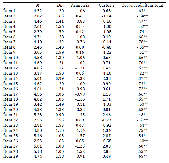 Se observó en primer lugar los datos descriptivos de los ítems y la correlación ítem-total, hallándose correlaciones estadísticamente significativas en todos los casos. Las correlaciones oscilaron entre los .22 y los .78 puntos (rho) (Tabla 1).