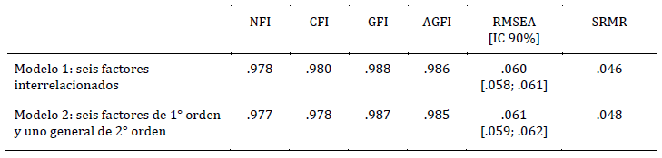 El primer modelo puesto a prueba fue el sugerido por la versión original del instrumento, a saber, seis factores interrelacionados. El ajuste del modelo se presenta en la Tabla 2 y el gráfico de resumen del modelo en la Figura 1. Puede observarse un buen ajuste del modelo a los datos, con cargas factoriales apropiadas. Se observó solo una carga factorial por debajo de los .30 (i.e., 22 puntos) para el ítem 13. No obstante, se optó por conservar este ítem atendiendo a la validez de contenido y a que el ajuste del modelo resultó muy bueno.