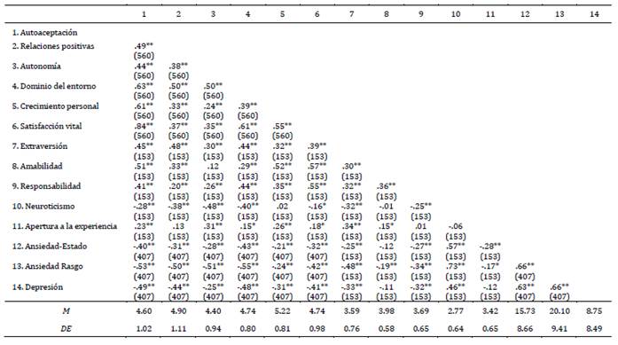 Los resultados se muestran en la Tabla 3, junto a los estadísticos descriptivos de cada variable. Se observaron correlaciones estadísticamente significativas entre la mayoría de las variables bajo análisis, todas en el sentido esperado. Mayores niveles de bienestar psicológico se asociaron de forma inversa con menores niveles de ansiedad y síntomas depresivos. A su vez, el bienestar psicológico se asoció de forma directa con los rasgos extraversión, amabilidad, responsabilidad y apertura a la experiencia. En cambio, mayores niveles de neuroticismo se asociaron con menores niveles de bienestar.