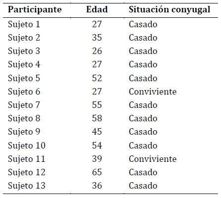 Los participantes pertenecen a los siguientes lugares: juntas de vecinos de Chillán; trabajadores del área administrativa de la Universidad del Bío-Bío de Chillán; y personas derivadas de conocidos. La población requerida para el estudio debió cumplir con los criterios de inclusión y exclusión correspondientes: ser hombres de veinticinco años o más, con educación media completa, que ejerzan el rol paterno, pertenecientes a una familia de tipo biparental, que mantengan una convivencia física cercana y habitual con su pareja e hijos, haber ejercido la paternidad al menos durante tres años y pertenecer a la zona urbana de Chillán. La lista de participantes puede visualizarse en la Tabla 1.