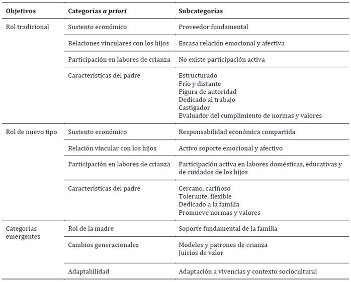 Como se muestra en la Tabla 2, desde el primer objetivo específico de la investigación, que buscó definir las características del rol paterno tradicional en las familias biparentales chilenas, se desprendieron las siguientes categorías a priori: sustento económico, relaciones vinculares con los hijos, participación en labores de crianza y características del padre. Las mismas categorías a priori utilizadas en el segundo objetivo específico, que corresponde a definir las características del rol paterno de nuevo tipo en las familias biparentales chilenas. Sin embargo, las subcategorías presentan diferencias para cada objetivo específico presentado.