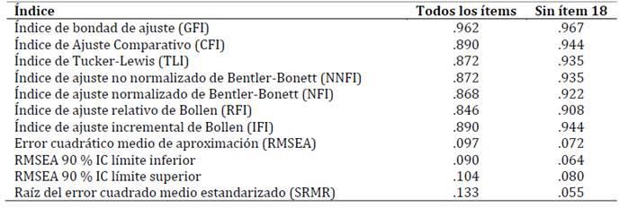En la Tabla 2 se muestran los análisis factoriales confirmatorios como evidencia de validez desde la estructura interna. Se realizan análisis con la totalidad de reactivos, y después sin el reactivo 18 (presentó bajos niveles de ajuste, baja carga factorial y además los índices de modificación mostraban que cargaba en los otros dos factores).