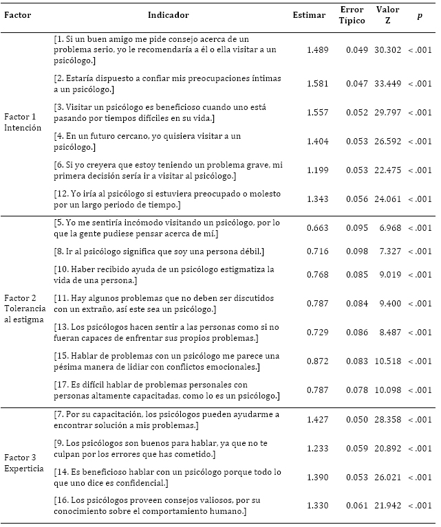 En cuanto al número de reactivos, este se redujo en uno para un total de 17 ítems, ya que el ítem 18 fue eliminado. Esto concuerda con el estudio en Islandia, donde el ítem 18 también refiere bajos indicadores de ajuste y se propone su eliminación (Ægisdóttir & Einarsdóttir, 2012), y con la adaptación guatemalteca, donde, para mejorar los bajos indicadores del reactivo, se reubicó de la subescala de tolerancia al estigma a la subescala intención (Figueroa et al., 2020).