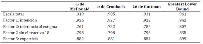 La adaptación en Islandia fue realizada por Ægisdóttir y Einarsdóttir (2012), quienes agregaron 6 ítems nuevos y eliminaron dos originales -el ítem 5 y el 18-, para un total de 22 ítems que les permitiera mantener las tres dimensiones planteadas del estudio original en los análisis factoriales confirmatorios con altos índices de ajuste del modelo. A nivel de fiabilidad, se presentaron valores alfa de Cronbach entre .70 y .86. En cuanto a la adaptación para población omaní, Alrahji (2021) adaptó el instrumento con estudiantes universitarios: realizó un análisis factorial confirmatorio con el cual se mantuvo la estructura original de la prueba, conservando la totalidad de los ítems, encontrando valores alfa de Cronbach mayores a .70 y correlaciones ítem-total mayores a .30 en las tres dimensiones. A nivel de fiabilidad para la adaptación guatemalteca, tras la reorganización de ítem-dimensión planteada por los autores, hubo un ajuste adecuado, contaron con correlaciones entre ítem-subescala que oscilaban de .54 a .83 y se obtuvo un alfa de Cronbach de .84 en cuanto a intención, .74 para tolerancia al estigma y .80 para experticia (Figueroa et al., 2020).