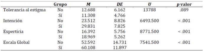En la Tabla 5 se observa la presencia de diferencias significativas entre los dos grupos, tanto en las dimensiones de intención y de experticia como en el puntaje general, indicando un valor estadísticamente mayor para quienes están asistiendo a consulta.