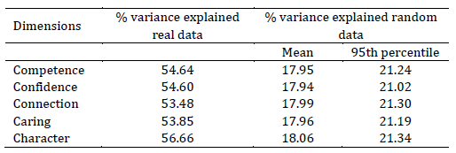 It is noted that all factors indicated explained variance greater than the average of the variances obtained through the randomly estimated matrices, that is, 500 matrices estimated by the permutation method (Buja & Eyuboglu, 1992). Additionally, they were also higher than the value of variance explained in the 95th percentile among the random data.