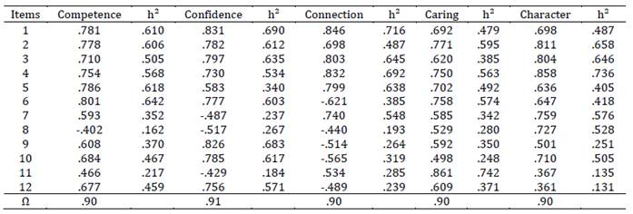 Based on the solution indicated by the parallel analysis, the EFA itself was carried out, using the one-dimensional solution for each of the subscales representing each C of positive youth development in sports. Table 2 presents the factor loadings, commonality and precision using McDonald's omega coefficient.