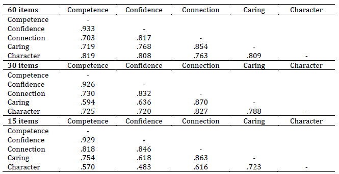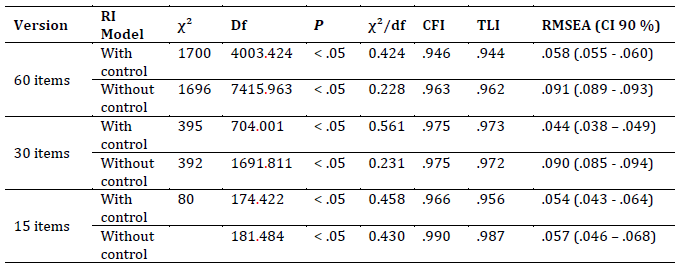 In Table 4, it is still possible to verify a factorial load for the random intercept factor, equal to .289 for the 60-item version, equal to .274 for the 30-item version and equal to .326 for the 15-item version. The result suggests that approximately 8.3 % of the variance of the 60-item version, 7.5 % of the variance of the 30-item version, and 10.6 % of the variance of the 15-item version can be attributed to response bias. The correlations between the factors of each version are presented in Table 5. The results indicated a strong relationship between the characteristics, which varied between .703 and .933 for the 60-item version, between .594 and .926 for the 30-item version and .483 and .929 for the 15-item version.
