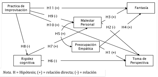 El objetivo de este estudio fue analizar la contribución estadística de los meses de práctica de improvisación teatral y la rigidez cognitiva sobre la empatía desde el modelo del afecto a la cognición de la empatía mediante un modelo estadístico integrado. Las hipótesis planteadas se muestran en la Figura 1.
