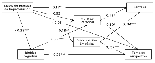Así, el modelo obtuvo un buen ajuste (χ²/gl = 0, 473; CFI = 1.000; IFI = 1.010; RMSEA = .000 (IC90 % = .000 - .073); SRMR = .020 (Kline, 2011). Las relaciones hipotetizadas y coeficientes estimados se muestran en la Figura 2. La mayoría de las hipótesis se cumplieron, con excepción de H9 (meses de práctica de improvisación → malestar personal) y H10 (meses de práctica de improvisación → toma de perspectiva). Posteriormente, se probó un modelo alternativo excluyendo las hipótesis no cumplidas. El modelo tuvo un buen ajuste (χ²/gl = 0, 416; CFI = 1.000; IFI = 1.017; RMSEA = .00 (IC90 % = .00 - .047); SRMR = .021) (Kline, 2011).