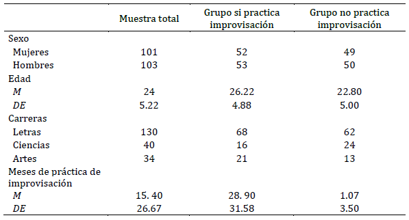 Se usó un muestreo no probabilístico por conveniencia. La muestra la compuso 204 jóvenes y adultos peruanos. Los participantes fueron seleccionados según su pertenencia a dos grupos: uno de practicantes de improvisación teatral en los últimos 6 meses (Grupo con práctica de improvisación) y otro grupo de no practicantes (Grupo sin práctica de improvisación). Los participantes con práctica fueron contactados con la colaboración de docentes de 10 escuelas de improvisación teatral, y los sin práctica fueron contactados en universidades y centros de trabajo. La muestra total tuvo un tamaño con un poder estadístico mínimo para realizar un análisis de senderos (Kline, 2011). En la Tabla 1 se muestran las características sociodemográficas de la muestra.