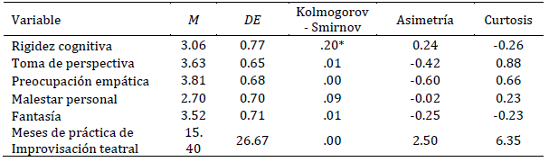 En la Tabla 2 figuran los estadísticos de la media, la desviación estándar y de la prueba de normalidad de cada una de las variables estudiadas.