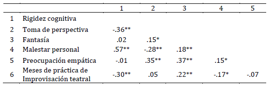 Este estudio tuvo algunas limitaciones. En relación con aspectos metodológicos, no empleó un diseño experimental, por lo que no se podrían establecer relaciones causales entre la práctica de improvisación, rigidez y empatía, además de que no se controló la posible influencia de otras variables relevantes como el sexo o la edad (Hernández et al., 2010; Israelashvili & Karniol, 2018). Asimismo, tampoco se analizó a detalle la influencia del tiempo de práctica de improvisación sobre las dimensiones de la rigidez cognitiva. En cuanto a aspectos teóricos, el estudio no incluyó variables que midan aspectos más afectivos y que pueden impactar en la empatía.