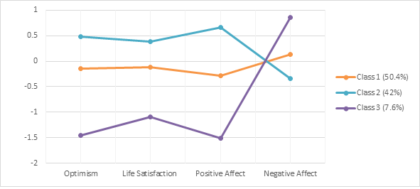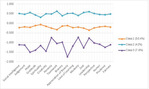 The profiles identified for the three-class solution are shown in Figure 1. Class 2 grouped individuals with higher scores on character strengths, close to half a standard deviation above the mean. Class 1 grouped individuals close to the mean but slightly below it in all character strengths. Class 3 grouped individuals with the lowest scores on character strengths.