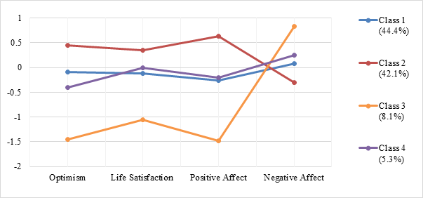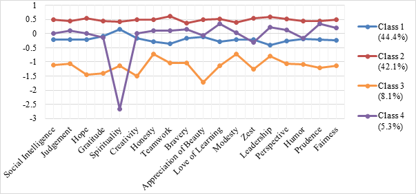 In the four-class solution (Figure 3), Classes 1, 2, and 3 resembled Classes 1, 2, and 3 from the three-class solution. In Class 3, the character strength with the most significant impairment was appreciation of beauty. However, Class 4 exhibited a particularity. Although most individuals had scores close to the mean, this class grouped individuals with the lower scores in spirituality (more than 2.5 standard deviations below the mean). The results indicate a group of individuals who do not have any spiritual or religious beliefs but have average scores in all other character strengths.