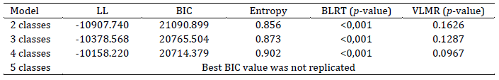 To address the study objective, LPA were performed, starting with two classes. The solution for five classes did not converge; therefore, the maximum limit that could be run with this sample was four classes. The LL and BIC indices favored the solution with four classes (Table 1), and when considering the interpretability of the other models, the three-class and four-class models were considered interpretable.