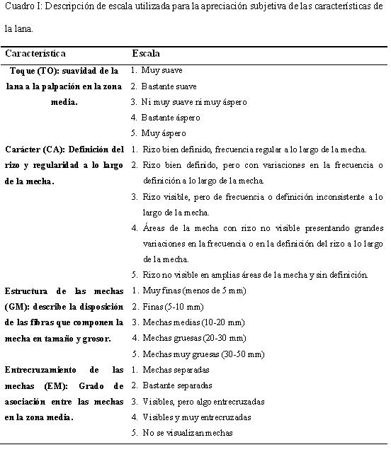 - Apreciación subjetiva de las características de la lana:: se evaluaron mediante un escore de 1 a 5; siendo 1 el valor máximo y 5 el mínimo. Los escores se basaron en los desarrollados por AWTA (2007) y el utilizado por Crook y col. (1994). En el Cuadro I se detallan las características evaluadas y se describe la escala utilizada.