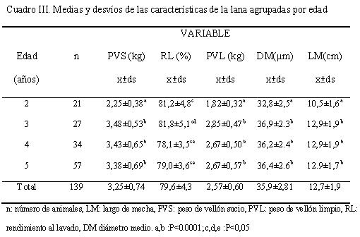 Las características de la lana fueron afectadas por la edad, sin constarse diferencias significativas por el estado reproductivo de las ovejas. En Cuadro III se presentan las medias y desvíos correspondientes a las características de la lana de las muestras de la zona de costilla. La categoría de 2 dientes registró menores pesos de vellón sucio y limpio, largo de mecha y diámetro promedio, mostrando diferencias significativas con las demás categorías (P<0,0001). El DM de las fibras fue de 36,0±2,8 µm, valor que se encuentra dentro del rango de lanas gruesas. El rendimiento al lavado fue alto (79,6±4,3 %) existiendo diferencias entre los animales de 4 dientes con los 6 dientes y boca llena (P<0.05).