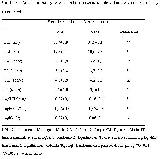 En las 61 ovejas de las que fueron extraídas muestras de costilla y cuarto se constataron diferencias significativas en todas las características medidas objetivamente o evaluadas subjetivamente, excepto en el grado de entrecruzamiento de fibras, como se muestra en el Cuadro 5. La lana correspondiente a la zona de cuarto presentó mayor DM que la de zona de costilla (37,5±3,1 µm y 35,7±2,9 µm, respectivamente), fue más corta, más áspera y tuvo un mayor grado de entrecruzamiento de fibras entre las mechas (P<0,01). El carácter también presentó diferencias entre zonas mostrado una mayor definición y regularidad del rizo la muestra procedente de costilla (P<0,05).
