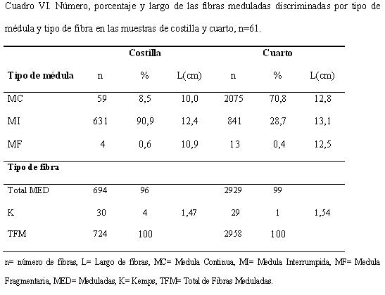 En relación al tipo de fibra medulada, el mayor porcentaje registrado correspondió a fibras MED, tanto en zona de costilla como en zona de cuarto (96% y 99%, respectivamente), mientras que el porcentaje de K fue bajo en ambas zonas (4% y 1%, respectivamente). En el Cuadro VI se puede observar que en las fibras MED el tipo de médula continua fue la que se presentó con mayor proporción en la lana de cuarto (70,8 %). En las muestras de costilla el 90,9 % de las fibras MED correspondió a medula interrumpida y solamente el 8,5% tuvo medula continua. La proporción de fibras con médula fragmentaria fue baja en ambas zonas.