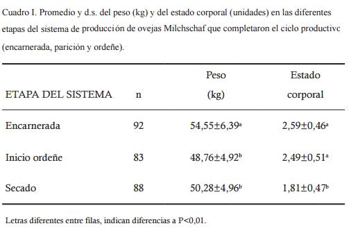 Al destete de los corderos e ingreso al ordeñe hubo un descenso del peso (P<0,01) el cual se mantuvo hasta el momento del secado, este peso fue a lo largo del período menor en borregas 2 dientes (42,97+4,22) que en el resto de las categorías (51,93+5,30 kg), P<0,01. El estado corporal de las ovejas se mantuvo entre la encarnerada y el inicio del ordeñe, posteriormente descendió y en el momento del secado fue de 1,81+0,47 (P<0,01); no hubo diferencias estadísticamente significativas entre los ovinos de las distintas edades (P<0,01).