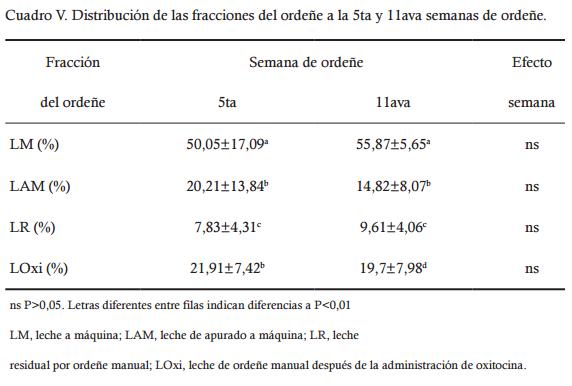 En la evaluación de la aptitud al ordeñe mecánico, realizado en las 5ta y 11ava semanas de ordeñe, se obtuvo un volumen total de leche (L) en el día de 0,726±0,198 y 0,522±0,113, respectivamente, una disminución (P<0,01) que se corresponde con la evolución general de la producción lechera de las ovejas. La distribución porcentual de las fracciones de ordeño se muestran en el Cuadro V, los cuales no fueron diferentes entre la 5ta y 11ava semanas de ordeñe (P<0,01), tampoco fue significativa la interacción entre los efectos (P<0,01).