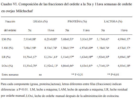 Promediando los datos de las dos semanas, se extrajo 53% con la máquina de ordeñe sin intervención del ordeñador, 18 % con el apurado a máquina, 9% con repaso a mano y 21% con el ordeñe posterior a la inyección de oxitocina. En la extracción con la máquina de ordeñar (LM y LAM), el apurado (LAM) representó un 25% de lo ordeñado. La composición de las fracciones de ordeño se presenta en el Cuadro VI.