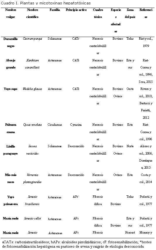 Poisoning by plants and mycotoxins are the cause of significant economic losses in countries dedicated to cattle farming, mainly due to the death of animals and lower production. To control and prevent poisonings, it is essential to know the clinical signs and lesions produced by plants and mycotoxicosis. The aim of this study was to provide brief and accessible information to the practitioner making diagnosis on farm animals, about poisonous plants and mycotoxins commonly found in diagnosing ruminants in Uruguay. In order to carry out this work we used as reference sources: peer-reviewed journals, undergraduate degree thesis, books, seminars and conference communications. A total number of 37 genera and 45 species of toxic plants belonging to 20 botanical families were found. About toxicogenic fungi, 13 species belonging to 9 genera of 6 different families were found. Among the diagnosed plants, most of them belong to the Asteraceae (Compositae) family, followed by the Gramineae, Solanaceae and Fabaceae (Leguminoseae) families. The main genres of toxigenic fungi Aspergillus, Penicillium, Fusarium and Claviceps have been diagnosed in the country. From a pathological perspective, hepatotoxic plants and mycotoxins were the most numerous. The information presented as tables will provide veterinarians an easy approach to this subject.
