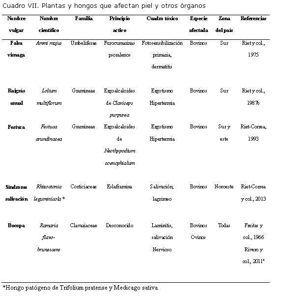 Las especies vegetales y fúngicas se presentan agrupadas de acuerdo a los cuadros clínico-patológicos que producen para facilitar el abordaje de esta temática. Es así que se incluyeron 8 cuadros, con nombres vulgares y científicos de plantas y hongos, familia a la que pertenecen, principios activos, cuadros tóxicos, especies animales afectadas, zonas donde han sido diagnosticadas y las referencias encontradas en la bibliografía consultada. Los 7 primeros cuadros contienen intoxicaciones por plantas y micotoxinas s diagnosticadas, el último presenta plantas sospechosas de producir intoxicaciones, cuyos resultados experimentales fueron negativos.
