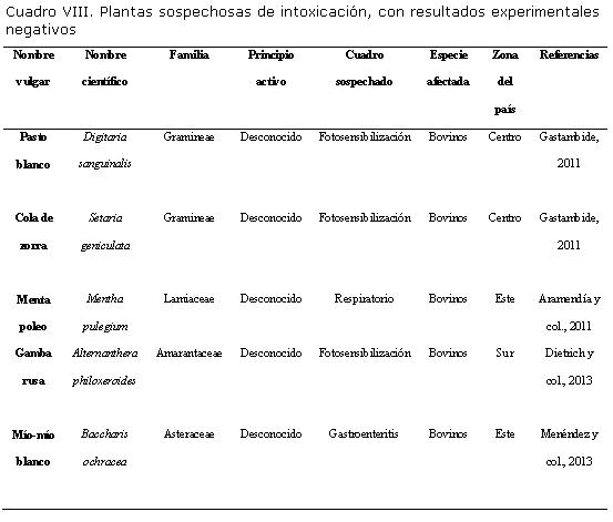 En Uruguay, los Laboratorios de Diagnóstico de la Dirección de Laboratorios Veterinarios (DILAVE), estiman en un 10% los casos reportados debido a la ingestión de plantas tóxicas en bovinos en el Laboratorio Regional Noroeste de Paysandú y de 16% para el Laboratorio Regional Este de Treinta y Tres. En ovinos los porcentajes de casos reportados, son de 11% en la región noroeste y 15% en el este. Se reconocen 31 especies vegetales tóxicas de importancia pecuaria en nuestro país (Rivero y col., 2011a). Sin embargo en los últimos años, el aporte de las tesis de grado de la Facultad de Veterinaria, ha incrementado el número de plantas tóxicas reconocidas, algunas de estas incluídas en el trabajo de Rivero y col. (2011a) y otras estudiadas posteriormente. La toxicidad de plantas como Sessea vestioides (Figura 1) (Alonso y col., 2006), Quercus robur (Arruti y col., 2007), Senecio grisebachii (Monroy y Preliasco, 2008), Lathyrus hirsutus (Figura 2) (Aldecoa y col., 2010), Senecio madagascariensis (Arrospide y col., 2010), Melia azedarach (Alonso y Luzardo, 2011), Cestrum parqui (Bauzá y col., 2012) ha sido comprobada experimentalmente en bovinos. Mientras que en ovinos Nierembergia rivularis (Figura 3) (Etcheberry y col., 2008), Phytolaca dioica (Iriarte y col., 2011), Wedelia glauca (Figura 4) (Bertucci y Parietti, 2011), Nerium oleander (Albanell y col., 2013), Sessea vestioides (Domínguez, 2013) y Vernonia plantaginoides (Costa y col., 2014) son las especies tóxicas comprobadas.