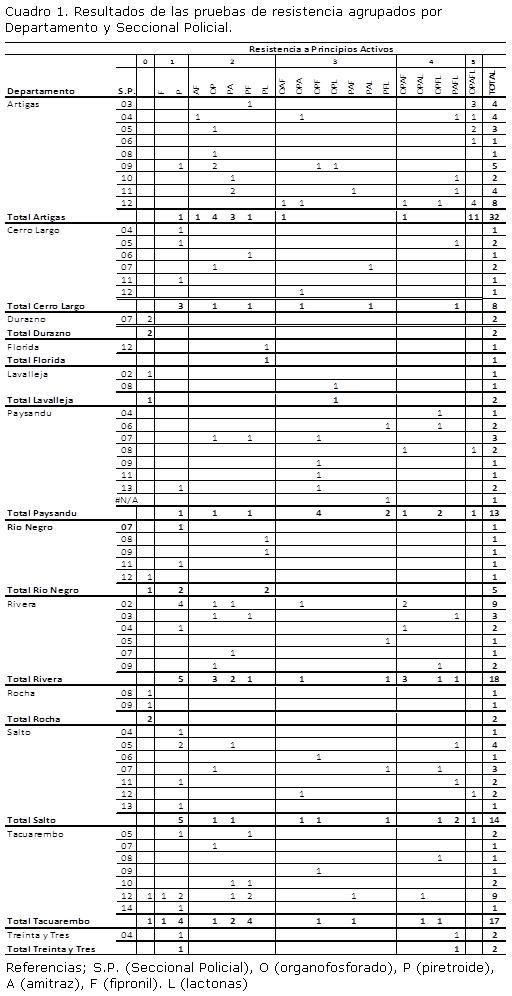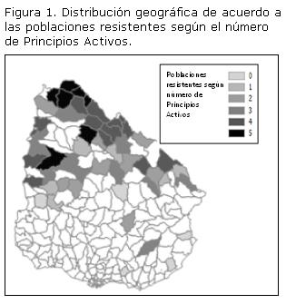 Del total de las poblaciones estudiadas, 7 fueron susceptibles a todos los principios activos y provenían de los Departamentos de Tacuarembó, Durazno, Lavalleja y Rio Negro, representando el 6% de la muestra. El 53,3% presentaron como máximo resistencia a 2 principios activos y el 29,3% a 4 y 5 componentes.