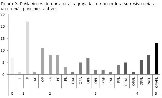 En la Figura 2 se observa la frecuencia de las distintas de moléculas a la cual las poblaciones de garrapatas presentaron resistencia en forma simultánea.