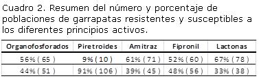 Las poblaciones de garrapatas analizadas demostraron mayor resistencia a los piretroides (91%) que a los organofosforados (44%). Para amitraz y fipronil se detectó resistencia en 39 y 48% respectivamente, del total de poblaciones estudiadas. Mientras que el grupo de lactonas macrocíclicas resultó el principio activo con menor porcentaje de garrapatas resistente, 33% (Cuadro 2).
