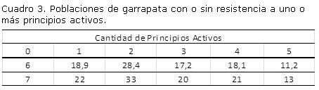 En el presente trabajo se demostró que la dispersión de las combinaciones de moléculas resistentes, no presentan un perfil definido, lo cual refuerza la necesidad de realizar el diagnóstico de eficacia a nivel predial.
