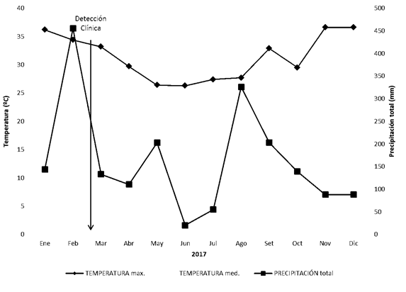 Los datos climáticos fueron obtenidos de los registros de la Estación Meteorológica perteneciente a Estación Experimental Mario Cassinoni (EEMAC) de la Facultad de Agronomía, UdelaR ubicada a 4 km del predio. En los meses de Enero y Febrero previos a la detección clínica de la infección se registraron temperaturas mayores a 32°C durante 22 días y constantes precipitaciones en el departamento (Estación Experimental “Dr. Mario A. Cassinoni”, 2018) (Figura 1).