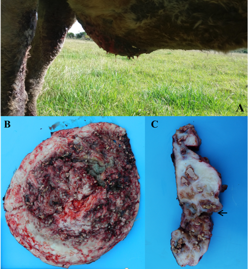 Figura 2: A: Equino. Deformación a nivel de abdomen ventral. B: Equino. Tejido extirpado en su cara adyacente a la pared abdominal. Se observa abundante tejido de granulación, extensas áreas de fibrosis y focos amarillentos de textura caseosa (“kunkers”). C: Equino. Corte transversal del tejido extirpado. Tejido de granulación, áreas multifocales de necrosis con contenido supurativo hemorrágico y concreciones blanco amarillentas (“kunkers”) (flechas).