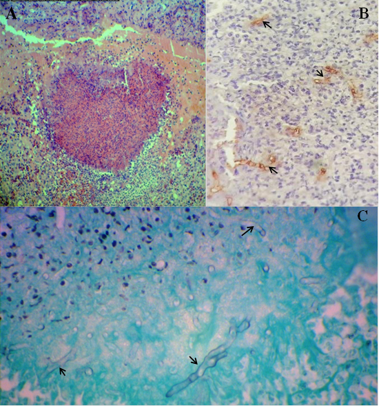Dentro de las áreas de necrosis se observó la presencia de hifas coloreadas positivamente con la coloración argéntica de Grocott (Figura 3).