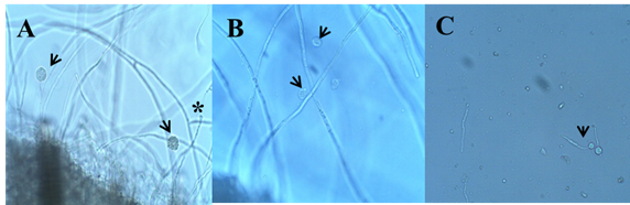 Figura 4: Zooesporogénesis in vitro de P. insidiosum, 3 horas de incubación a 37ºC. A: Presencia de vesícula (asterisco) en la extremidad de la hifa e esporangios conteniendo zoosporas en su interior (flechas) 20x. B: Zoosporas con forma ovoide (flechas) 40x. C: Zoosporas emitiendo tubos germinativos (flecha) 20x.