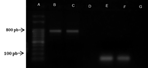 Figura 5: PCR-anidado en gel agarosa A: Marcador de peso molecular 100pb DNA ladder (Ludwig Biotec, Brasil). B: aislamiento de P. insidiosum, fragmentos de ~800pb generados con los cebadores (ITS1 e ITS4); C: P. insidiosum CBS 101155 (control positivo); D: agua ultra pura (control negativo); E: aislamiento de P. insidiosum con amplicones de ~105pb generados con los cebadores específicos de P. insidiosum (PI1 y PI2). F: P. insidiosum CBS 101155 (control positivo); G: agua ultra pura (control negativo).