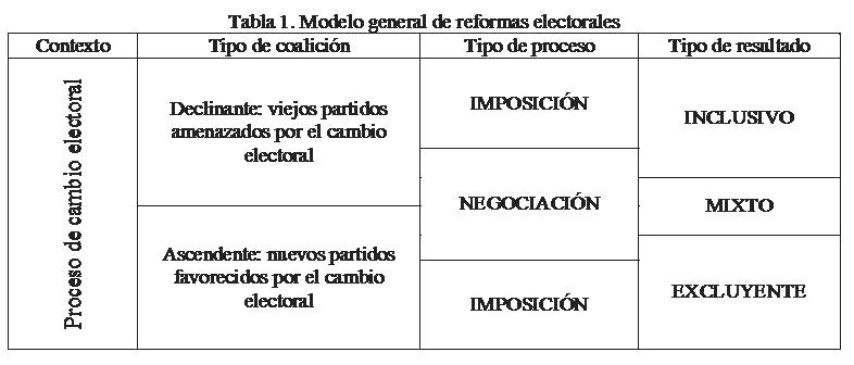 Evidentemente, las reformas electorales en el mundo real no tienen por qué responder a uno de los dos modelos de forma pura, fundamentalmente por dos razones: en primer lugar porque la racionalidad imputada a los actores no es perfecta ni la información de que disponen es completa, por lo que podrían apoyar reformas que los perjudiquen electoralmente y, en segundo lugar, porque la coalición reformista no constituye necesariamente un actor unitario, por lo que a su interior pueden coexistir intereses diversos y contrapuestos que conducirían a una reforma negociada con medidas de diverso tipo. En este caso, la reforma resultante puede contener tanto normas más excluyentes como más inclusivas. Por lo tanto, el resultado depende también del proceso político a través del cual se concrete la reforma, en función del poder y la homogeneidad con los que cuente la coalición reformista. Si se da un proceso de imposición de una coalición reformista con intereses homogéneos (ya sea declinante o ascendente) podemos esperar que el resultado se aproxime bastante a alguno de los tipos puros de reforma. En cambio, si la coalición reformista original debe ampliarse con otros actores para viabilizar la reforma, es más probable que se obtenga un resultado mixto. La siguiente tabla representa sintéticamente el modelo expuesto.