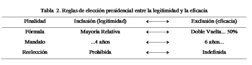 La lógica del trabajo asume variables bipolares y, en los tres casos, un extremo favorece la legitimidad y el otro la eficacia. Así, la incorporación de métodos de DV o el aumento del umbral requerido para obtener el triunfo en primera vuelta, la prohibición de la reelección inmediata y la reducción de la duración del mandato presidencial son reformas inclusivas que aportan legitimidad al sistema, eventualmente en detrimento de su eficacia, y favorecen los intereses de coaliciones gobernantes que se sienten amenazadas en contextos críticos. En cambio, el uso de métodos de MR o de umbrales reducidos, la adopción de la reelección inmediata y la prolongación de la duración del mandato presidencial, son reformas excluyentes que aportan eficacia al sistema, eventualmente en detrimento de su legitimidad, y favorecen los intereses de coaliciones gobernantes que cuentan con apoyo popular. La siguiente tabla resume el esquema de variables utilizado.