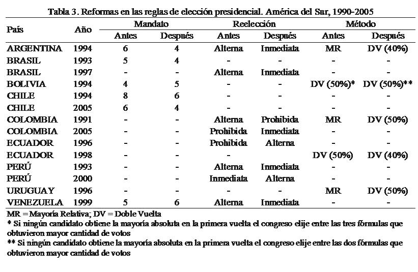 En esta investigación se ha sistematizado y analizado información referente a todas las reformas que modificaron los mecanismos de elección presidencial en América del Sur entre 1990 y 2005. Todos los países de la región han realizado al menos una modificación en al menos una de las variables utilizadas[10]. La siguiente tabla presenta la información.