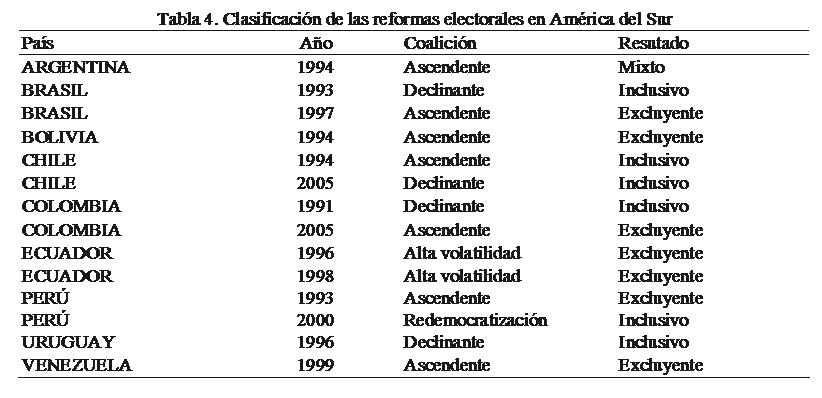 Por su parte, Bolivia llevó adelante una reforma que generó un amplio consenso dentro del sistema político en 1995. El esquema de la investigación la clasifica como excluyente porque las modificaciones relacionadas con la elección presidencial tienen ese carácter. Sin embargo, la reforma incluyó otros aspectos que bien pueden catalogarse como inclusivos y legitimadores. Pero en la práctica, el promotor de la reforma (el MNR) era un partido triunfador en ese momento que bien podía percibirse como ganador en adelante y, por lo tanto, con incentivos para promover reformas excluyentes.