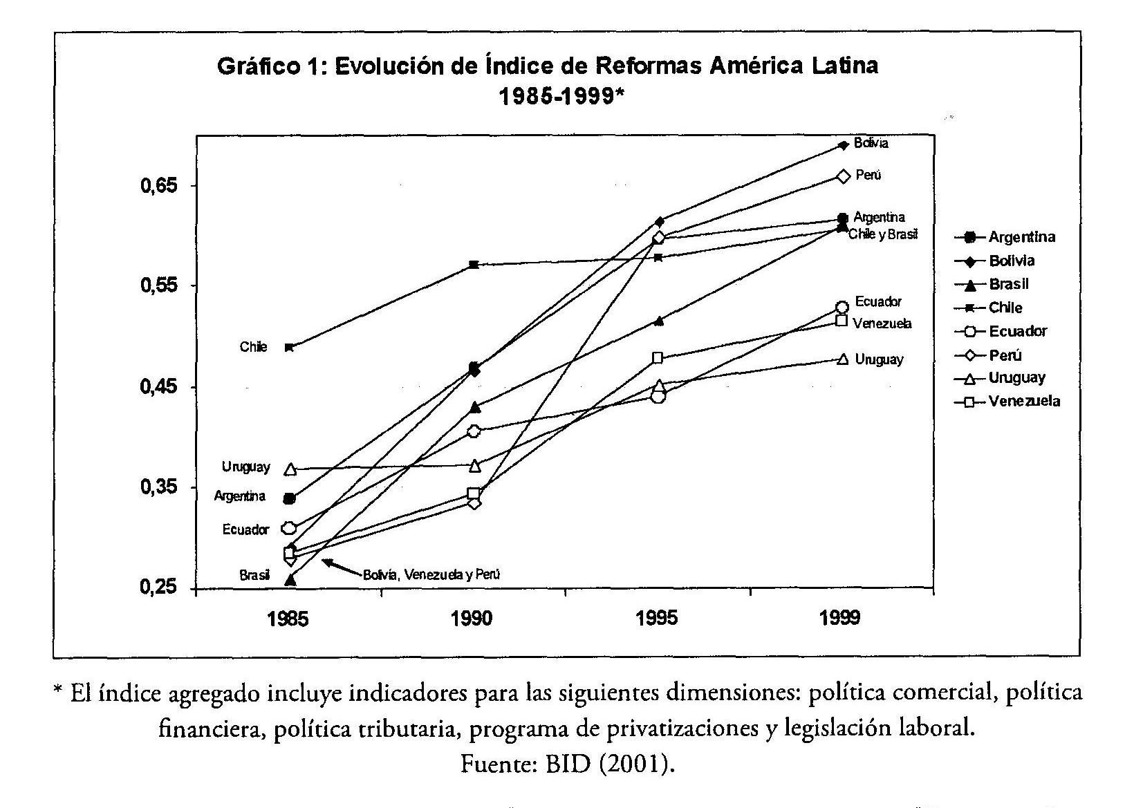 [2] Los altos valores que presentaba Uruguay en términos de liberalización comercial a mediados de los 80, así como en áreas como la financiera o tributaria es la que explican su elevado posicionamiento en el índice de reformas al comenzar el período analizado. Usualmente el país es identificado como un caso con reformas tempranas de primera generación, habiendo luego diferido o enlentecido las reformas de segunda generación.