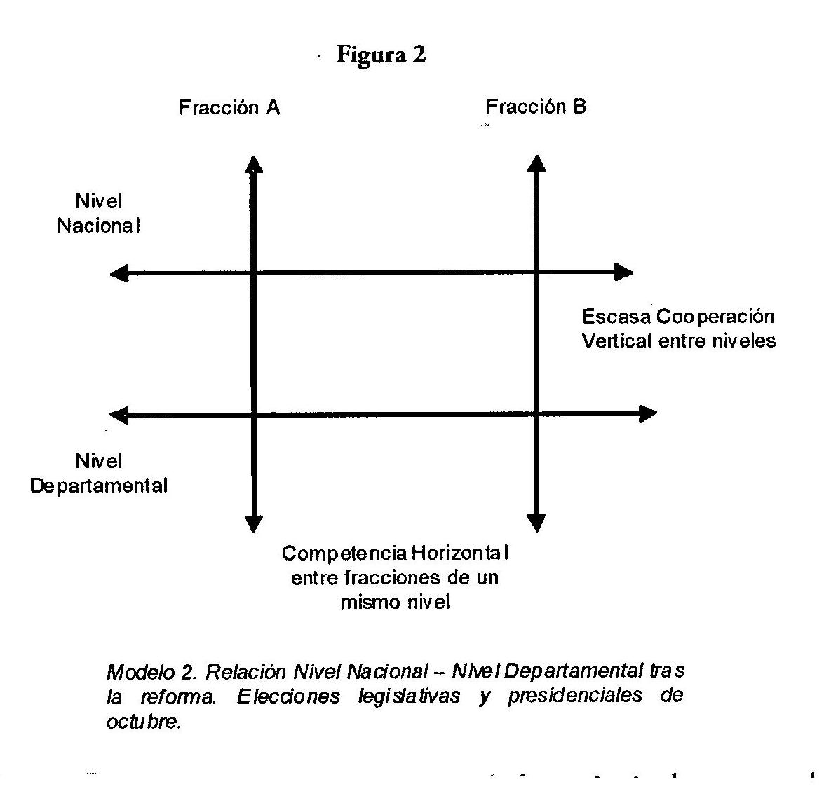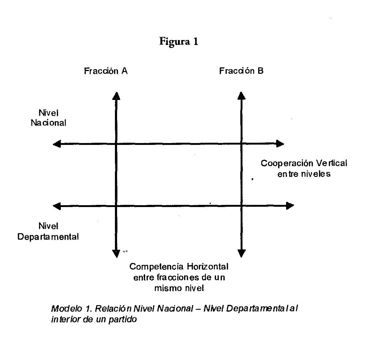 La hipótesis planteada afirma que el sistema electoral previo a la reforma de 1996 favorecía la cooperación entre el nivel nacional (NN) y el nivel departamental (ND) de los partidos, estableciendo una determinada pauta de articulación entre ambos. La segunda parte de la hipótesis señala que, por el contrario, el nuevo régimen ofrece pocos estímulos para la cooperación en las elecciones nacionales de octubre y noviembre, lo cual lleva al deterioro de la pauta anterior. En las elecciones internas los diversos actores locales "miden fuerzas", para posteriormente orientarse a uno de los niveles, ya sea, a través de la participación en las elecciones nacionales (NN), o bien con la participación en las elecciones municipales (ND). A partir de estas afirmaciones iniciales se presentaron dos modelos de articulación entre los niveles de competencia, que se corresponden con el comportamiento de los diversos actores en los períodos pre y post reforma electoral.